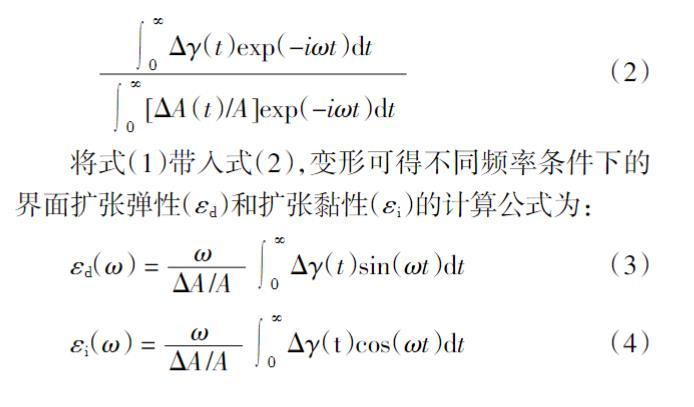 對(duì)于一個(gè)幅度為ΔA的瞬間界面形變過程,在形變停止后,在一定頻率(ω)下擴(kuò)張頻率模量(ε)的數(shù)值可以通過對(duì)界面張力衰減曲線的Fourier變換得到,如式(2)所示: