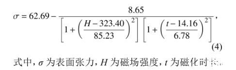 式中,z表示溶液表面張力,z0表示零點偏移量,x表示磁場強度,y表示磁化時長,A1~A5分別為x~x5的系數,B1~B5分別為y~y5的系數。