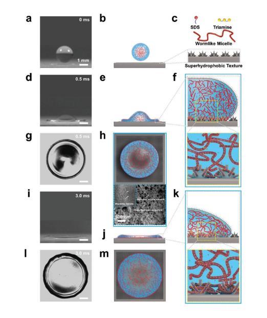 圖3.活性低聚表面活性劑高速撞擊超疏水表面后均勻鋪展的示意圖。a、b)液滴包含三維纏結的蠕蟲狀膠束網絡。c)SDS、三胺、蠕蟲狀膠束和具有微/納米結構的超疏水表面的示意圖。d–h)表面活性劑分子快速擴散到新形成的界面,并緊密堆積在水-空氣界面。蠕蟲狀膠束被迫伸展以固定水。在快速擴散過程中,擴散邊緣穩定且均勻。h)蠕蟲狀膠束的密集網絡纏繞著基底的微納米結構,三胺/SDS液滴撞擊后的低溫掃描電鏡圖像支持了這一觀點,其中較大的圖像顯示了較小圖像底部的網絡。f)表面活性劑分子與基質具有很強的相互作用,蠕蟲狀膠束網絡與基質的微/納米結構纏繞在一起。i–m)在最終平衡狀態下,致密的蠕蟲狀膠束存在于擴散外圍并與微/納米結構纏繞在一起。左欄中所有液滴的比例尺均為1毫米。