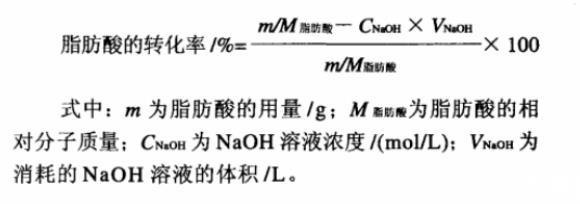脂肪酸轉化率的測定:以酚酞為指示劑,用0.05mol/L NaOH溶液滴定反應液中未反應完的脂肪酸量。計算脂肪酸的反應轉化率。