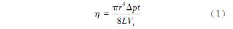 毛細管黏度計也稱為管型黏度計,常見的是U形玻璃管黏度計。U形玻璃管一個臂中有精確的窄孔(毛細管),在毛細管的上部是測量球,測量球的上下部分存在兩個校準標記;另一個臂的下端有一個儲液球。在使用中,液體被吸入測量球中,然后液體向下流過毛細管進入儲液器。液體在兩個標記之間通過的時間是黏度(η)的量度。毛細管黏度計的原理是基于Poiseuille定律: