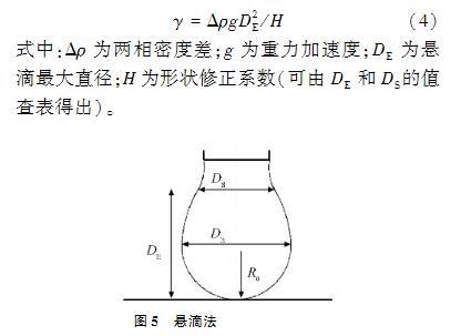 Jyoti等使用軸對稱液滴形狀分析法(axisymmetricdropshapeanalysis,ADSA)研究單層壓縮速率對表面張力?表面積等溫線形狀的影響。懸滴法(見圖5)可認為是ADSA的雛形,其通過Laplace方程應用于液滴輪廓來確定懸垂液滴的表面張力和接觸角,懸滴法實質上是滴外形法的一種。滴外形法的基本原理是:當液滴在管口形成時,液滴形狀與表面張力存在一定的關系。懸滴法測量表面張力可由下列公式計算:γ=ΔρgD2E/H(4)式中:Δρ為兩相密度差;g為重力加速度;DE為懸滴最大直徑;H為形狀修正系數(可由DE和DS的值查表得出)。