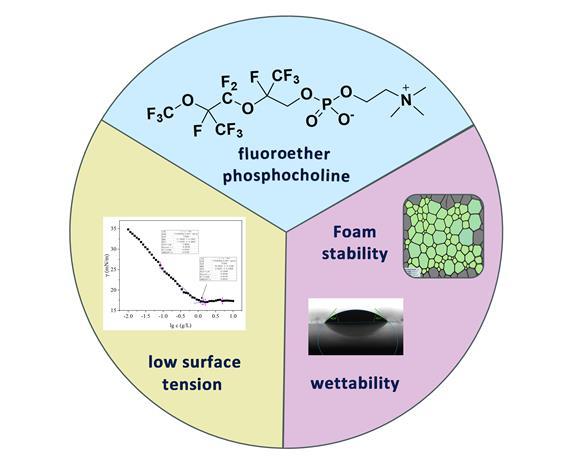 將氧原子引入到氟磷酸膽堿表面活性劑中,會(huì)對(duì)磷酸膽堿性能產(chǎn)生怎樣的影響呢?我們?cè)O(shè)計(jì)合成了一種新型氟醚磷酸膽堿表面活性劑(圖1b),考慮到長(zhǎng)氟碳鏈和長(zhǎng)氟醚鏈段具有生物累積性,我們選用了氟碳鏈為6的短鏈結(jié)構(gòu),并向其中插入兩個(gè)氧原子,將新化合物與一個(gè)鏈長(zhǎng)相近的氟磷酸膽堿表面活性劑進(jìn)行對(duì)比,結(jié)果表明新型氟醚磷酸膽堿表面活性更佳。我們進(jìn)一步探索了新氟醚磷酸膽堿的泡沫性能與潤(rùn)濕性能,結(jié)果表明氟醚磷酸膽堿的穩(wěn)泡性好、可在聚四氟乙烯(PTFE)上潤(rùn)濕,是一類具有良好應(yīng)用前景的表面活性劑。