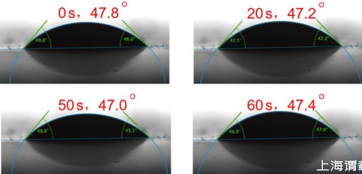圖61 g/L的C72-MPB水溶液在PTFE上不同時間的潤濕狀態