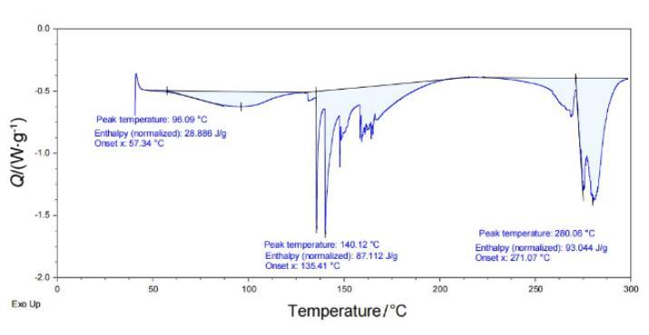 TGA圖中可以看到樣品的失重主要集中在100℃以下和250℃到300℃,DSC圖中可以看出樣品的吸熱主要有三個區域,分別在100℃以下,140——170℃和260——300℃。結合TGA和DCS來看,在溫度100℃以下部分是少量溶劑及產物中的水蒸發,溫度達到140℃時,DSC中有吸熱峰,但TGA曲線沒有變化,說明產物發生相變,從固體轉變為液體,直到250℃左右開始失重,最終仍有11.54%固體剩余證明一定存在分解現象并產生固體產物,結合DSC圖中有多個吸熱峰來看推測是產物有多步分解,也不排除存在部分的汽化失重的可能性。