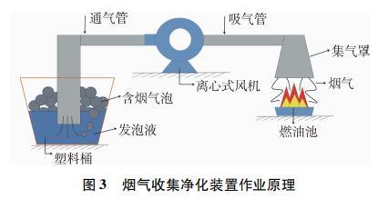 煙氣收集凈化裝置主要由置液桶、通氣管、離心式風機、吸氣管、集氣罩和燃油池等組成,其凈煙工作原理如圖3所示。風機抽走集氣罩下燃油池中汽油燃燒的黑煙,將其通入桶內發泡液中;氣體進入液體后會立刻浮出液面,在液體表面張力作用下排出液面的煙氣被液膜包裹成含煙氣泡;隨著煙氣不斷被通入發泡液中,含煙泡泡很快就溢滿整個置液桶。實驗前測量并記錄水及發泡液的pH值。