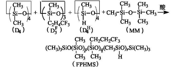 在裝有攪拌器、溫度計(jì)、回流冷凝管的四口燒瓶中,按n(D4)∶n(D3F)∶n(D4H)∶n(MM)=1∶1∶1∶1比例依次加入D4、D3F、D4H、MM,攪拌下加熱升溫至50——60℃,緩慢加入濃H2SO4(占單體總的質(zhì)量分?jǐn)?shù)3%),控溫在50——60℃反應(yīng)4 h.后升溫至80——90℃,加適量Na2CO3,反應(yīng)數(shù)小時(shí),使體系pH近5——6,冷卻,靜置,抽濾,得無色透明液體,即中間體含氟含氫聚硅氧烷(FPHMS),其含Si-H基的氫質(zhì)量分?jǐn)?shù)為0.343%.反應(yīng)式為: