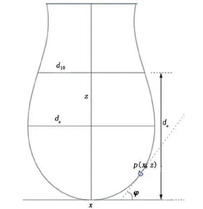 懸滴法測定液體的表面和界面張力原理見圖5。其中,de為懸滴最大直徑;d10為離頂點(diǎn)距離為de處懸滴截面直徑。