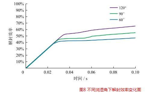 孔隙表面潤濕性對注氣解封過程及流體微觀分布具有較大影響。建立120°、90°和60°等3種不同潤濕角的模型分別代表潤濕反轉劑作用后疏水、中性潤濕和親水的情形,研究不同潤濕性條件下流體微觀分布演化特征和解封效率差異性(圖8)。從圖中可以看出,孔隙壁面親水條件下,注入氣體沿著阻力小的大孔喉快速竄流,出口端見氣較早,說明孔隙壁面親水有助于水封氣藏的快速解封;但解封過程中氣體很難進入小孔喉區域內,這是由于親水孔隙中的毛細管力對氣驅流動產生較強的抑制作用,且微觀竄流通道內孔隙表面形成水膜,導致氣體微觀波及效率降低,局部區域仍具有較高的含水飽和度,解封效率較低。孔隙壁面疏水條件下,毛細管力是氣驅水的動力,緩解了毛細管指進引起的水相快速突破,一定程度地促進了注氣解封驅替前緣的均勻發展,導致氣體微觀波及效率升高,因此,疏水孔隙的解封過程氣體突破較慢,但解封效率較高。而孔隙壁面中性潤濕條件下,解封過程的突破時間和解封效率介于前兩者之間。因此,隨著潤濕反轉劑濃度的增加,潤濕反轉劑能夠將孔隙表面潤濕性由親水轉化為疏水,對解封過程產生一定的抑制作用,但能夠大幅提高解封效率。