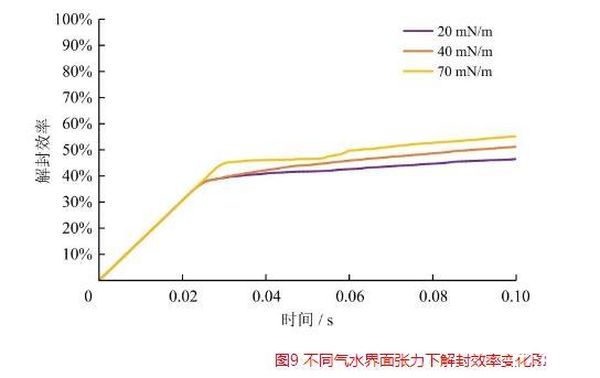 氣水界面張力對注氣解封過程及流體微觀分布具有較大影響。建立70 mN/m、40 mN/m和20 mN/m等3種不同的氣水界面張力的模型,分別代表潤濕反轉劑作用后的氣水界面張力變化情況,研究不同氣水界面張力條件下流體微觀分布演化特征和解封效率差異性(圖9)。從圖中可以看出,隨著氣水界面張力的降低,毛細管力減小,大幅降低注氣解封過程流體流動阻力,促進了氣相優勢通道的快速形成,說明氣水界面張力的降低有助于減小解封壓力,實現水封氣藏的快速解封;但同時氣水界面張力的降低,會導致氣體微觀波及效率降低,部分區域仍具有較高的含水飽和度,解封效率略微降低。因此,隨著潤濕反轉劑濃度的增加,潤濕反轉劑能夠降低氣水界面張力,對解封過程產生明顯的促進作用,但解封效率會略微降低。