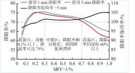 壓裂液降阻率的變化階段分別對應(yīng)了壓裂液的低黏、中黏和高黏,充分了解這一變化規(guī)律,可以合理進行變黏控制以滿足壓裂施工不同階段(造縫階段、成網(wǎng)階段、支撐階段)對壓裂液降阻性能的特殊要求;同時,測試過程中還發(fā)現(xiàn),低黏液(0.2%以內(nèi))的降阻率保持率在96%以上,而中黏液、高黏液經(jīng)過5 min循環(huán)剪切后降阻率保持率超過100%,與本體系的結(jié)構(gòu)流體特性(剪切稀釋性、觸變性)密切相關(guān),這一特性也消除了深井大排量壓裂面臨的壓裂液降阻性能降低或失效的風(fēng)險。