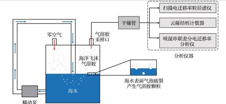 SSA生成裝置能夠在實(shí)驗(yàn)室環(huán)境中模擬自然海洋系統(tǒng),實(shí)現(xiàn)在受控條件下從天然海水中產(chǎn)生SSA,并結(jié)合儀器表征顆粒的粒徑分布和理化特性。目前常用的模擬裝置有鼓泡式發(fā)生器、射流式發(fā)生器及波浪破碎式發(fā)生器等。本文以射流式SSA發(fā)生器為例,介紹SSA的生成原理(圖2)。通常來說,發(fā)生器都具有進(jìn)水口、進(jìn)氣口和采樣口。利用蠕動(dòng)泵將海水從發(fā)生器底部周期性循環(huán)到頂部噴嘴,形成一個(gè)俯沖射流水柱,撞擊水面并將空氣夾帶進(jìn)入海水中,在水下一定深度產(chǎn)生氣泡羽流。當(dāng)氣泡上升到水氣界面并破裂時(shí),產(chǎn)生SSA顆粒。采用潔凈零空氣作為載氣,將生成的SSA顆粒通過氣溶膠采樣口進(jìn)行采集,連接干燥管進(jìn)行干燥。此后,使用掃描電遷移率粒徑譜儀測(cè)量SSA的粒徑分布和數(shù)濃度等。該裝置可連接其他儀器,如CCN計(jì)數(shù)器和吸濕串聯(lián)差分電遷移率分析儀等進(jìn)行CCN活性及吸濕性等的表征。
