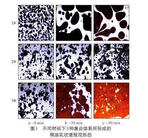 圖3不同時間下3種復合體系所形成的稠油乳狀液微觀形態