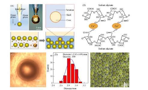 為了實(shí)現(xiàn)一步法制備大小均勻、尺寸可控、壁厚可調(diào)、生物相容的水/水微囊,需要設(shè)計(jì)同軸微流控器件,如圖1(A)所示。內(nèi)相黃原膠水溶液由內(nèi)管注入微流控器件;外相海藻酸鈉水溶液,由外管注入微流控器件。內(nèi)相在外相的剪切下形成液滴,同時(shí)外相在重力作用下脫離管口生成水包水的水/水微囊,并進(jìn)一步通過鈣離子交聯(lián)海藻酸鈉水凝膠網(wǎng)絡(luò),如圖1(B)所示。由于微流控器件對(duì)內(nèi)外相的精準(zhǔn)調(diào)控,水/水微囊在光學(xué)顯微鏡下具有清晰穩(wěn)定的核殼結(jié)構(gòu)圖1(C),平均尺寸(D)為(2.83±0.09)mm圖1(D)。該方法制備水/水微囊具有器件結(jié)構(gòu)簡(jiǎn)單、操作便捷、一步法成型、微囊尺寸均一可控、核殼結(jié)構(gòu)穩(wěn)定、無需后處理等優(yōu)點(diǎn)圖1(E)。