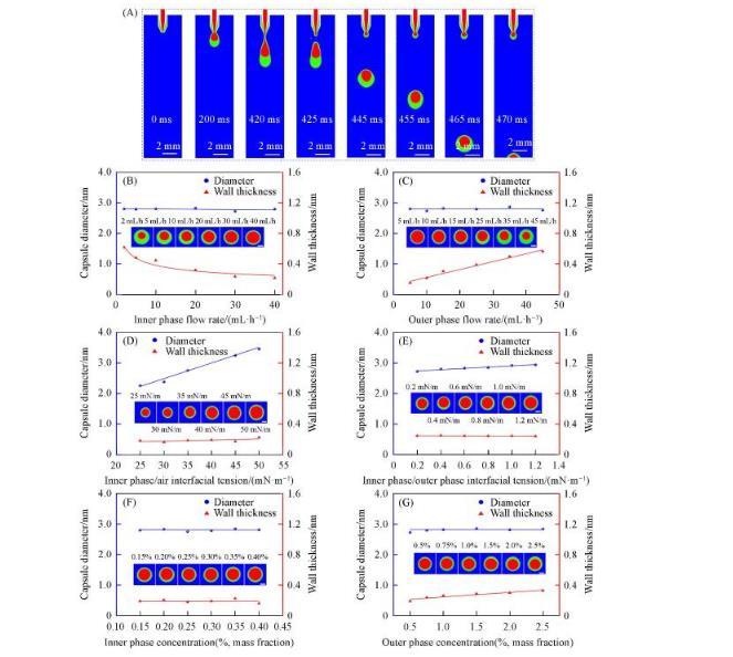 數(shù)值模擬與實(shí)驗(yàn)結(jié)果具有較好的一致性,數(shù)值模擬內(nèi)相/外相流速對(duì)水/水微囊直徑和壁厚的影響,得出了與實(shí)驗(yàn)數(shù)據(jù)一致的規(guī)律,即水/水微囊的直徑基本不隨內(nèi)相/外相流速的變化而變化,而水/水微囊壁厚隨內(nèi)相流速增加或外相流速減小都將減小,如圖4(B)和(C)所示。與實(shí)驗(yàn)相比,數(shù)值模擬可以更系統(tǒng)地調(diào)節(jié)各個(gè)參數(shù),如外相/空氣界面張力、內(nèi)相/外相界面張力對(duì)微囊直徑和壁厚的影響。隨著外相/空氣界面張力的增加,水/水微囊直徑成比例增加,這是由于外相/空氣界面張力使微囊懸掛在管口,重力使微囊脫離管口,當(dāng)外相/空氣界面張力增加,需要的重力相應(yīng)增加,造成水/水微囊直徑增加。當(dāng)內(nèi)相/外相界面張力增大時(shí),水/水微囊直徑略有增加。