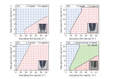 為了深入研究微流控器件結(jié)構(gòu)對(duì)水/水微囊成型過程的影響規(guī)律,分別制備了內(nèi)管管口內(nèi)縮、內(nèi)外管管口平齊、內(nèi)管管口伸出、內(nèi)管管口內(nèi)縮外管管口不拉伸等4種同軸微流控器件,并通過系統(tǒng)改變內(nèi)相和外相流速,判斷水/水微囊的成型情況,最終確定水/水微囊的制備相圖,分別如圖2(A)——(D)所示。水/水微囊形成的關(guān)鍵是內(nèi)相在外相的剪切下形成液滴,同時(shí)外相在重力作用下脫離管口生成水/水微囊。由于內(nèi)外相均是水溶液,內(nèi)相/外相界面張力較小,并且流體黏度較大,內(nèi)相不容易在外相的剪切下形成液滴,進(jìn)而被外相包裹形成水/水微囊,因此外相流速增大,對(duì)內(nèi)相剪切加強(qiáng),更易形成水/水微囊。