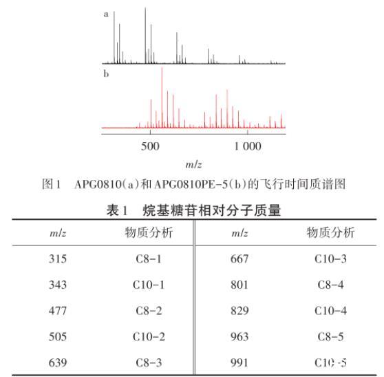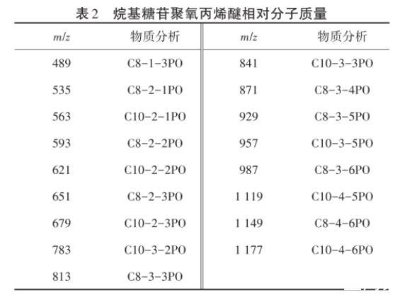 (1)以碳鏈數(shù)8/10、12/14的烷基糖苷(APG0810/APG1214)為原料,通過(guò)與環(huán)氧丙烷反應(yīng)得到聚醚產(chǎn)物,并通過(guò)TOF質(zhì)譜進(jìn)行結(jié)構(gòu)表征,結(jié)果表明PO基團(tuán)成功引入烷基糖苷中。