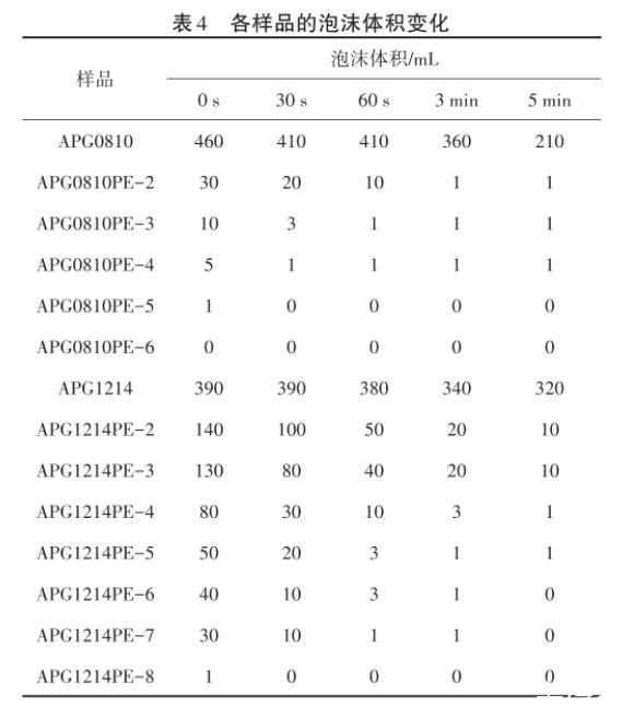 泡沫是氣體在液體中的分散體系,氣體成為氣泡被連續(xù)相的液體分隔開,氣體是分散相,液體是分散介質(zhì)。在大規(guī)模的洗滌和印染工業(yè)中,泡沫給操作帶來(lái)不便,因此新型的低泡表面活性劑越來(lái)越受關(guān)注。由表4可以看出,PO基團(tuán)引入APG中明顯地降低了泡沫的形成和穩(wěn)定性,而且在相同PO加合數(shù)下,APG0810變化更明顯,因此制備的系列樣品屬于低泡表面活性劑。
