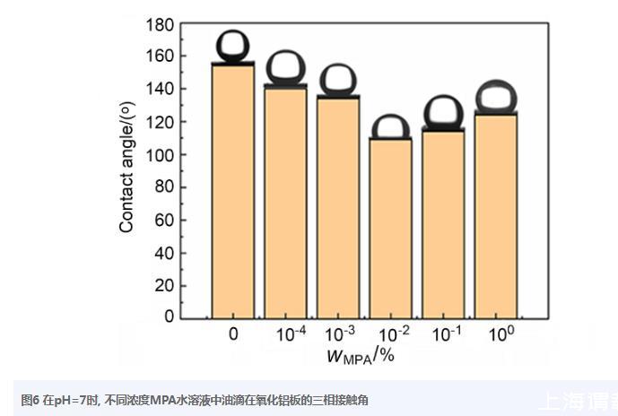 接觸角測量可以用來表征納米顆粒經改性后的親疏水性。本研究是以氧化鋁板作為模擬納米氧化鋁的基材,研究癸烷油滴在不同MPA濃度的溶液中(pH=7)在氧化鋁板上的三相接觸角,如圖6所示。當MPA濃度為0時,油滴與氧化鋁板的接觸角超過150°,說明氧化鋁在沒有MPA分子時具有較強的親水性。隨著MPA濃度逐漸增加,接觸角不斷降低,這是因為MPA濃度越高,在氧化鋁板上吸附的MPA分子越多,疏水性越強,油滴則可更容易吸附在界面上,當MPA濃度為0.01%(w)時,接觸角降到最低(110°)。然而,當進一步增加MPA濃度,接觸角反而逐漸升高,這是因為過多的Bola型分子結構MPA使親水性反而增加。該結果與Zeta電勢的結果趨勢類似,可以進一步印證了MPA分子吸附在了納米Al2O3顆粒表面上。