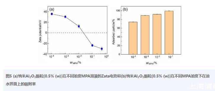 圖5(a)納米Al2O3顆粒【0.5%(w)】在不同濃度MPA溶液的Zata電勢和(b)納米Al2O3顆粒【0.5%(w)】在不同MPA濃度下在油水界面上的吸附率