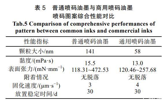 進(jìn)一步對(duì)2種油墨的噴碼及圖案綜合性能對(duì)比,結(jié)果如表5所示。可以看到:在固體顆粒大小以及流體黏度上,本通用油墨具有顯著優(yōu)勢(shì);在2種承印紙張上分別進(jìn)行噴碼,本通用油墨具有更小及更窄的表面張力分布。隨后使用3M長(zhǎng)膠帶對(duì)噴碼圖案表面進(jìn)行反復(fù)黏接,2種噴碼油墨的圖案均無(wú)墨跡脫落,體現(xiàn)出優(yōu)秀的附著力。最后,將圖案樣品均放置30 d,所有噴碼圖案均未出現(xiàn)形變、褪色和毛邊,證明具有良好的穩(wěn)定性。