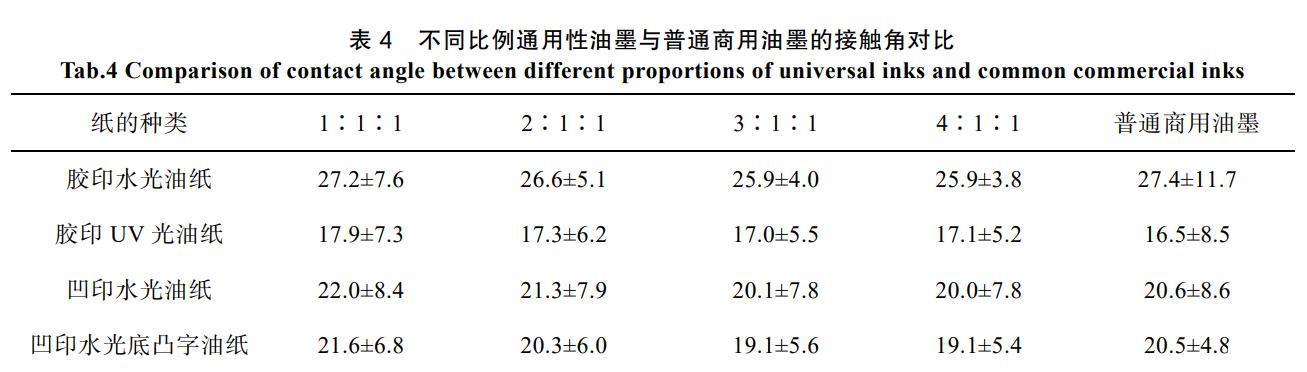 表4不同比例通用性油墨與普通商用油墨的接觸角對(duì)比