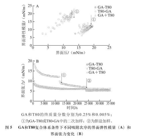 圖5 GA和T80復合體系條件下不同吸附次序的界面彈性模量(A)和界面張力變化(B)