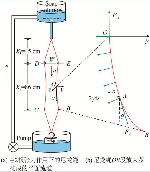 如圖1(a)所示,配制的皂液盛于上水箱中,經(jīng)一個狹長的出水管流出,進(jìn)入一個由兩根直徑為0.32 mm的尼龍繩構(gòu)成的豎直平面流道(實(shí)驗(yàn)中,尼龍繩一直處于下方砝碼施加的張力作用下)。緊接出水管口的流道為漸擴(kuò)的擴(kuò)張段,其下為流道寬度不變的實(shí)驗(yàn)段和流道逐漸收窄的收縮段(在本文實(shí)驗(yàn)中,擴(kuò)張段長度X1=45 cm;實(shí)驗(yàn)段長度X2=86 cm,實(shí)驗(yàn)段入口寬度W=5 cm)。在擴(kuò)張段,皂液在重力驅(qū)動下加速,當(dāng)重力和空氣阻力平衡時(shí)充分發(fā)展,最終在實(shí)驗(yàn)段達(dá)到勻速運(yùn)動,之后經(jīng)收縮段流入下水箱,再被泵回至上水箱,形成往復(fù)循環(huán)。