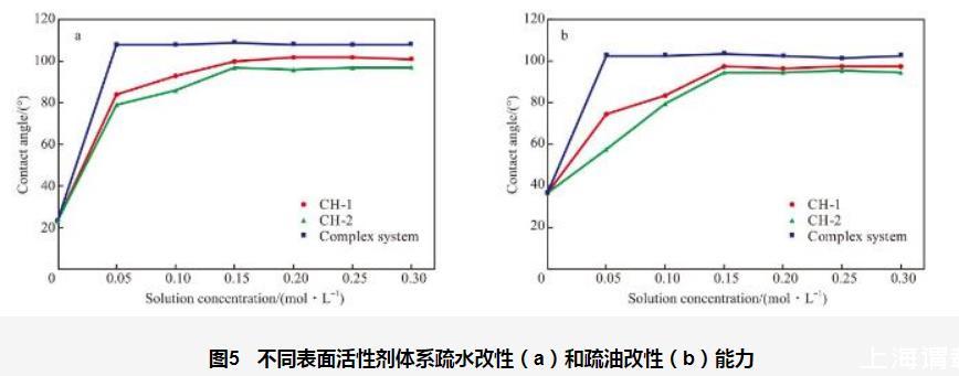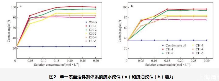 圖2單一表面活性劑體系的疏水改性(a)和疏油改性(b)能力