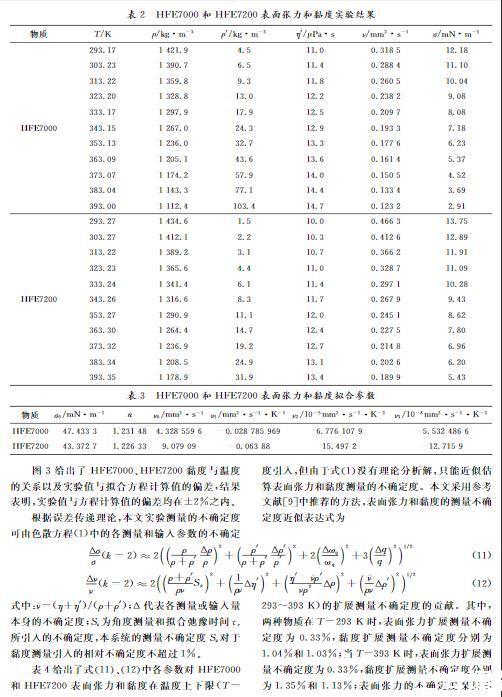 本文對HFE7000和HFE7200在飽和狀態(tài)下293.17~393.00 K和293.27~393.35 K溫度區(qū)間的表面張力和黏度進行了實驗研究,結果列于表2。