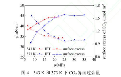 圖4 343 K和373 K下的界面張力和CO2界面過(guò)余量