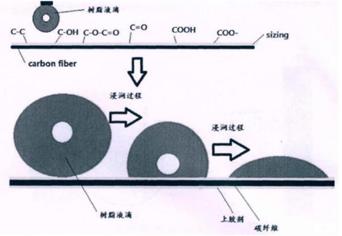 樹脂對(duì)碳纖維表面的浸潤(rùn)性影響因素有很多。碳纖維表面的比表面積的大小,碳纖維表面的溝槽結(jié)構(gòu)或纖維表面的活性基團(tuán)的數(shù)量和種類,均對(duì)碳纖維的浸潤(rùn)性有影響。