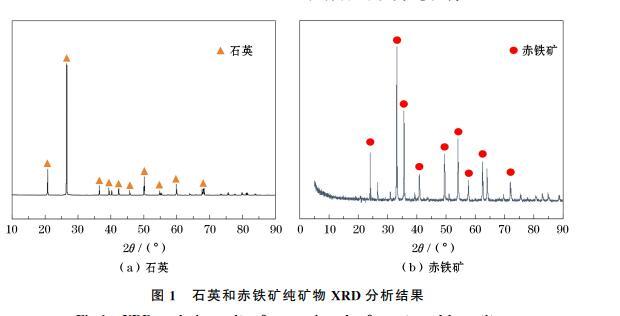 由表1可知,石英純礦物樣品中SiO2含量為98.37%,樣品中含有少量Al、Mg及其他微量元素,因此石英樣品可視為純礦物,滿足試驗要求。由表2可知,赤鐵礦中TFe含量為68.24%,樣品中含有少量Si及其他微量元素,雜質含量較少,因而赤鐵礦樣品可視為純礦物。