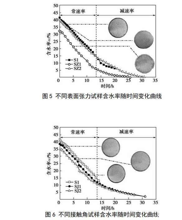 把篩好的土放入105℃烘箱內烘至恒重備用。設計土樣的干密度為1.5 g/cm3,含水率計算不考慮酒精溶液和肥皂水引起的液體密度變化,制樣含水率為16%~18%。采用輕型擊實儀制圓柱試樣,試樣直徑為102 mm,高40 mm,試樣制好后用真空飽和法進行飽和,其中,SZ1樣用20%酒精溶液飽和,SZ2樣用濃度為2 g/L的肥皂水飽和,其余試樣均為純水飽和,抽氣時間為6 h,試樣在真空下的浸泡時間為12 h。為縮短試樣的脫濕時間以減小酒精揮發造成的濃度降低,飽和試樣脫濕采用低溫烘干法,烘箱的溫度控制在50℃(小于酒精的沸點和十八胺的熔點),當2h內試樣的質量變化量不超過2 g時停止試驗。試驗開始后,前8 h每隔30 min把試樣從烘箱中取出后先稱重,隨后進行拍照記錄,稱重和拍照的時間控制在30s內,拍照結束后把試樣放入烘箱繼續脫濕,6 h以后拍照間隔時間增加為1 h。2試驗結果2.1水分蒸發與臨界含水率圖5給出了不同表面張力的3種試樣含水率隨時間變化的關系曲線。