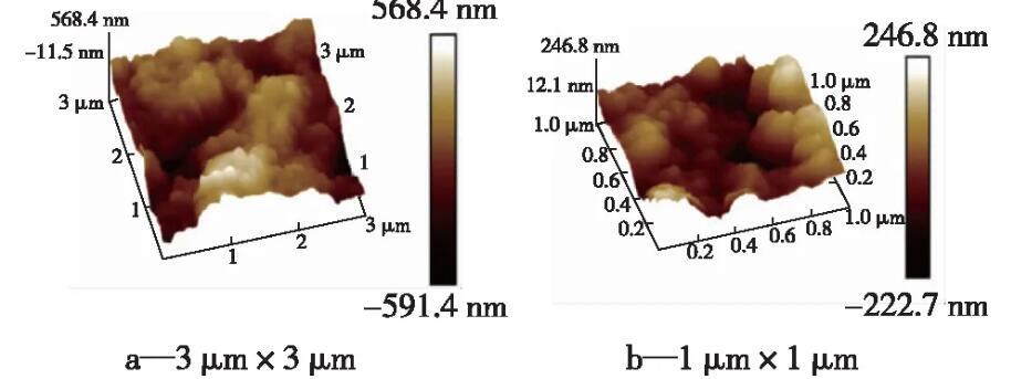 眾所周知,表面微結(jié)構(gòu)形貌在增強表面超疏性能方面起著重要作用。圖2是超疏涂層的SEM圖像,圖3是超疏涂層的AFM圖像。