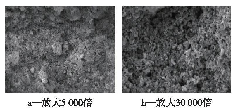 圖2a中能夠清楚地觀察到表面有1~2μm的凸起和200~300 nm的孔隙。圖2b是局部放大圖,明顯看出在涂層表面具有納米級的凹凸結(jié)構(gòu),且涂層表面分布有大量不均勻的粗糙孔結(jié)構(gòu)。許多小孔分布在這些凸起之間,小凸起與小孔共同形成珊瑚狀結(jié)構(gòu),導(dǎo)致更多的空氣被捕獲到這些孔隙中。