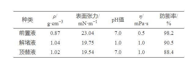 表3為解堵液體系的基本性能評價結果,可以看出,解堵液體系的黏度值和pH值較低,并且具有較低的表面張力,有利于注入和返排。另外,體系具有良好的防膨效果,能夠防止黏土礦物的水化膨脹。