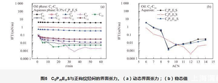 圖5 C8PmEnS與正構(gòu)烷烴間的界面張力。(a)動態(tài)界面張力;(b)穩(wěn)態(tài)值