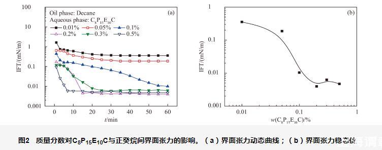 圖2質(zhì)量分?jǐn)?shù)對C8P15E10C與正癸烷間界面張力的影響。(a)界面張力動態(tài)曲線;(b)界面張力穩(wěn)態(tài)值