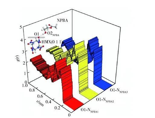 對(duì)于NPBA與HMX晶體界面間的分子間相互作用力情況,可通過(guò)計(jì)算體系內(nèi)各原子對(duì)的徑向分布函數(shù)g(r)予以分析。徑向分布函數(shù)是反映材料微觀結(jié)構(gòu)的特征物理量,它表示在距離某一設(shè)定中心粒子A為r處,另一設(shè)定粒子B的數(shù)目密度與B平均數(shù)目密度的比值,即