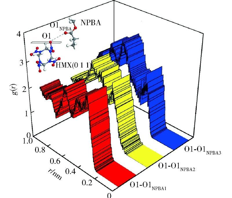由于體系的原子種類較多,考慮到篇幅因素,且相對(duì)于氮原子,—NO2基團(tuán)中氧原子與其他極性分子間的作用力更強(qiáng),為此僅選取了HMX(0 1 1)晶面上—NO2基團(tuán)中氧原子,對(duì)其與NPBA分子基團(tuán)上極性原子間的徑向分布函數(shù)進(jìn)行了計(jì)算,并根據(jù)徑向分布函數(shù)曲線峰的位置和高低判斷原子間的作用力類型和強(qiáng)弱。