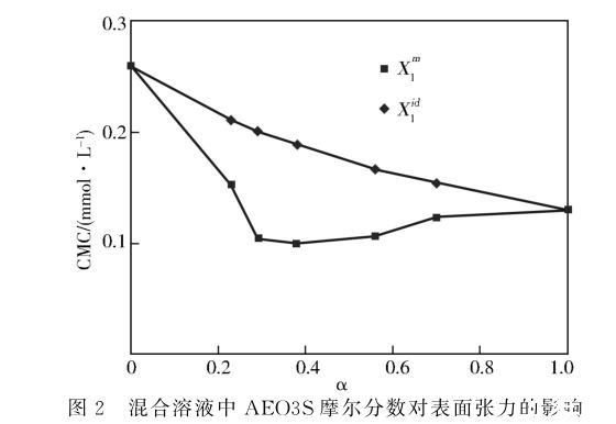 圖2混合溶液中AEO3S摩爾分數對表面張力的影響