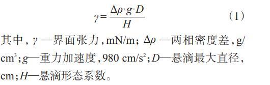 通過懸滴法測定油水間的界面張力。通過相機得到原油懸浮液滴在流體中的圖像和體積,由式(1)計算油水界面張力值。測定在不同礦化度(DW、FW、LW)的水中添加0~0.05%納米ZIF-8顆粒后的油水界面張力值。