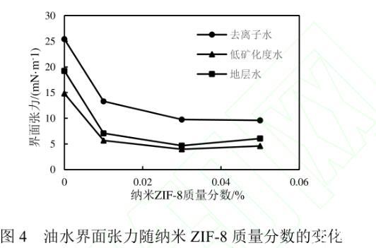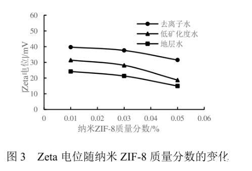 納米ZIF-8流體的穩定性是評價其能否作為驅油劑的重要性質之一。將裝有不同濃度納米流體的樣品瓶靜置15 d后,當ZIF-8的質量分數為0.01%、0.03%時,納米顆粒在不同礦化度的流體中均保持穩定狀態,無沉淀生成,說明適當濃度的納米ZIF-8顆粒在水中有著良好的穩定性。當ZIF-8的質量分數為0.05%時,靜置后的納米流體產生了少量沉淀,表明過高濃度的ZIF-8會互相聚結,導致顆粒變大,進而發生聚沉。