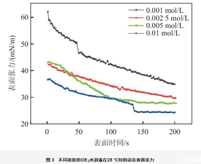 圖3不同濃度的OE3水溶液在25℃時的動態表面張力