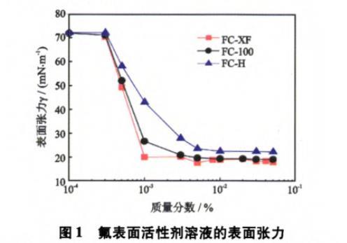 本研究的目的是獲得具有低表/界面張力且與巖石達到近似于中性潤濕的助排劑。首先,需要選擇表面活性劑。表面活性劑溶液達到臨界膠束濃度(cmc)后的表面張力(γcmc)是該表面活性劑溶液能夠獲得的最低表面張力。根據常見表面活性劑的γcmc數據,氟表面活性劑能夠使水溶液達到更低的表面張力。因此,在新型助排劑中將選用合適的氟表面活性劑以降低溶液的表面張力。其次,選擇潤濕性改變劑。要達到與巖石接近中性潤濕,需要調節助排劑在巖石表面的吸附作用,以改變巖石表面的性質使助排劑體系與巖石潤濕接觸角在75°~105°間(90°±15°)。此外,由于氟表面活性劑和潤濕性改變劑一般只能使油水界面張力降低到1 mN/m以上,因此要借鑒化學驅提高采收率中能夠與原油達到超低界面張力的表面活性劑的選擇方法,復配合適的碳氫表面活性劑以獲得能夠同時降低界面張力的助排劑體系。