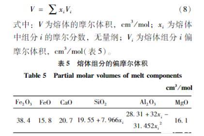 式中:V為熔體的摩爾體積,cm3/mol;x_{i}為熔體中組分i的摩爾分數,無量綱;V_{i}為熔體組分i偏摩爾體積,cm3/mol(表5)。