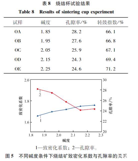 在堿度為1.85~2.25范圍內,燒結試驗表明,致密化系數與實測孔隙率呈現顯著的負相關關系(F_{Den}越大,孔隙率越小)。致密化系數與燒結礦的轉鼓指數(強度)在堿度1.85~2.15范圍內呈正相關(F_{Den}越大,強度越高)。在堿度提高至2.25時,雖然計算F_{Den}繼續(xù)增大,但實際燒結礦受高堿度下礦相變化(如硅酸二鈣晶型轉變)影響,孔隙率微升,強度微降,表明優(yōu)化堿度在2.15附近為佳。