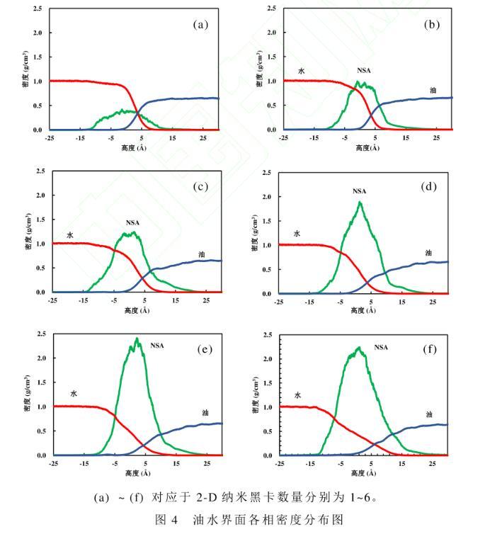 運用所構建的油水界面模型,研究2-D納米黑卡(NSA)在油水界面的密度分布及吸附行為,模擬結果如圖4所示。納米黑卡數量增加時,界面處油相密度變化幅度大。這是由于隨著納米黑卡數量的增加,接枝的直鏈烷烴與油相相互作用不斷增強所致。當體系達到平衡狀態,納米片大部分浸沒在水相中,直鏈烷烴主要浸沒在油相中。此時,納米黑卡所處的平衡位置受到納米黑卡重力和分子間相互作用力的影響很大,分子間相互作用力包括范德華力和靜電力。納米片偏親油性,顯示出與油水分子間的弱范德華力,而直鏈烷烴與油相分子間存在強范德華力,因此納米片被拉向油相。隨著納米黑卡數量的增加,油水界面納米片的密度隨之增加。納米黑卡的密度在中線附近出現峰值,當納米黑卡數量增至4片后繼續增加黑卡數量,在中線部分納米黑卡的密度增加量并不明顯,只是高峰變寬了。