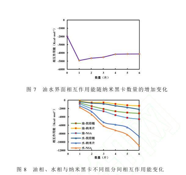 在油水體系中,納米黑卡數(shù)量為1時(shí),油相和水相與納米黑卡不同部分間相互作用能差別并不大,納米黑卡與水相相互作用能最低。隨著納米黑卡數(shù)量的增加,油水相與納米黑卡及不同部分間的相互作用能都呈現(xiàn)降低趨勢(shì)(圖7),其中,水相與納米黑卡及納米片相互作用能降低率遠(yuǎn)高于其他兩相間相互作用能降低率,說(shuō)明納米黑卡在與油水界面相互作用中,納米片部分占據(jù)了主要作用,與水分子引力強(qiáng),且易與水相形成穩(wěn)定存在狀態(tài)。納米黑卡與水相相互作用能較納米片與水相相互作用能低,是由于納米黑卡中包含了親水基團(tuán)(納米片)和親油基團(tuán)(烷烴鏈)與水相相互作用兩部分能量,從而導(dǎo)致該結(jié)果。